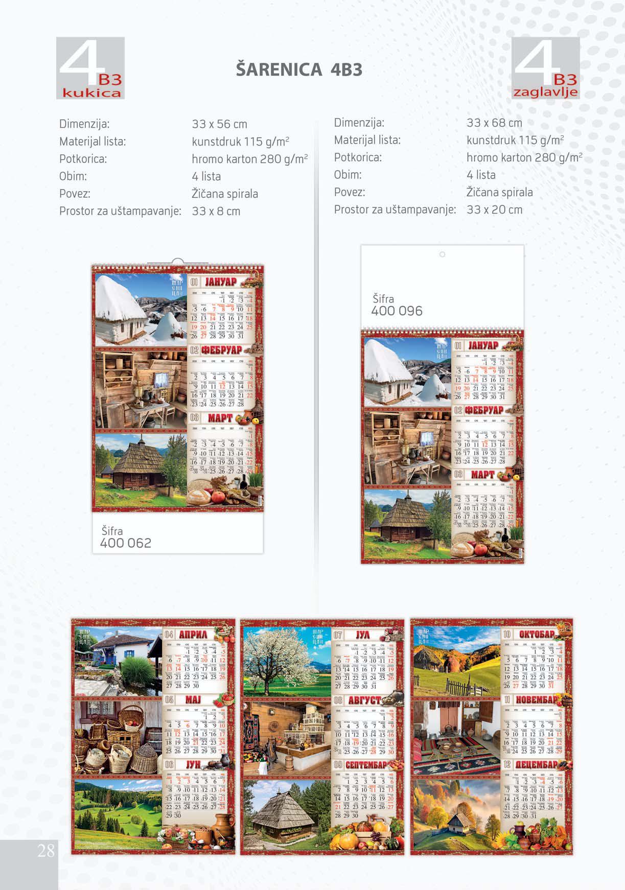 Dimenzija: 33 x 56 cmMaterijal lista: Kunstdruk 115g/m2Potkorica: Hromo karton 300g/m2Obim: 4 listaPovez: Žičana spiralaProstor za uštampavanje: 33 x 8 cm