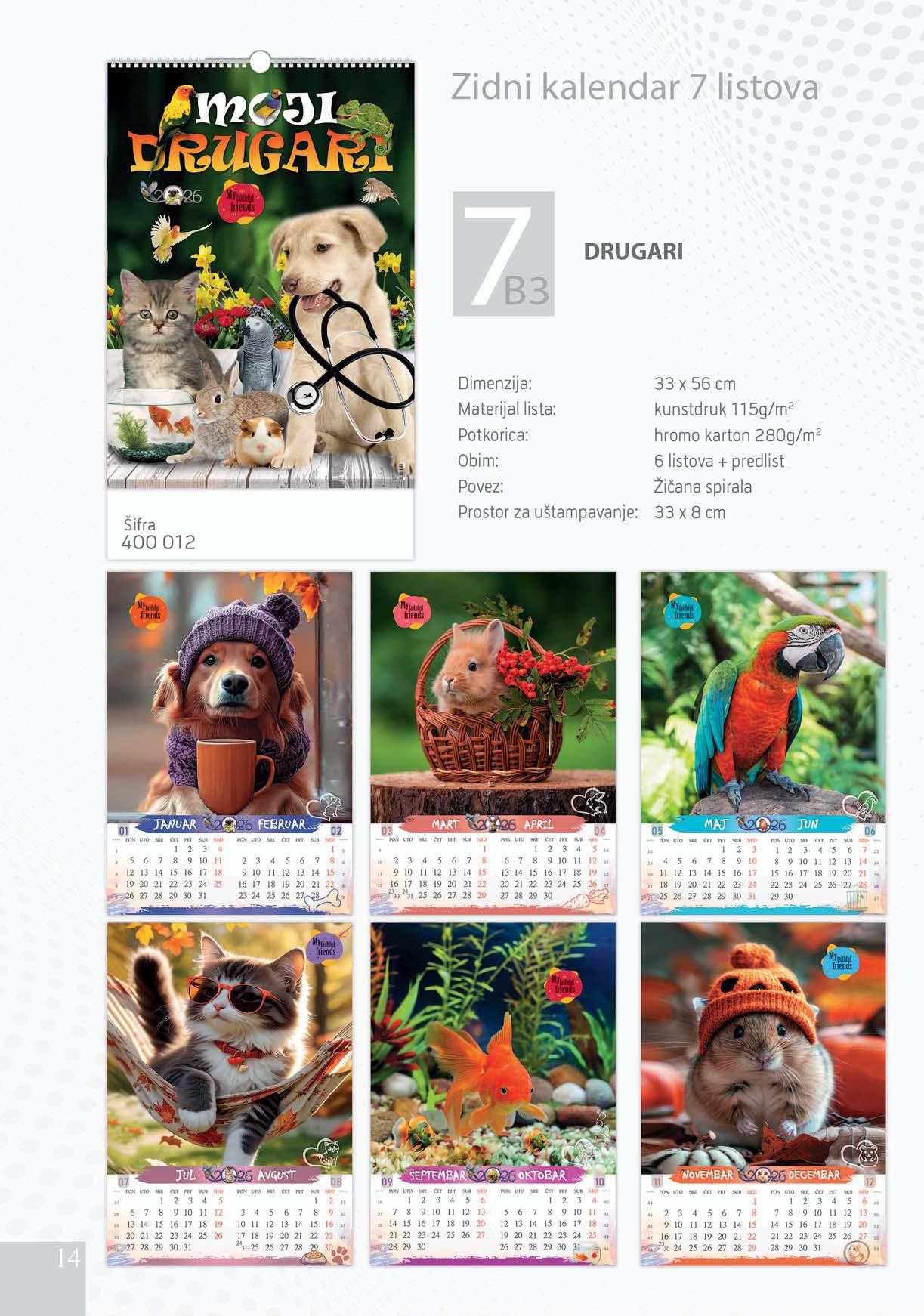 Dimenzija: 33x56 cmMaterijal lista: Kunstdruk 115g/m2Potkorica: Hromo karton 300g/m2Obim: 6 listova + predlistPovez: Žičana spiralaProstor za uštampavanje: 33x8 cm