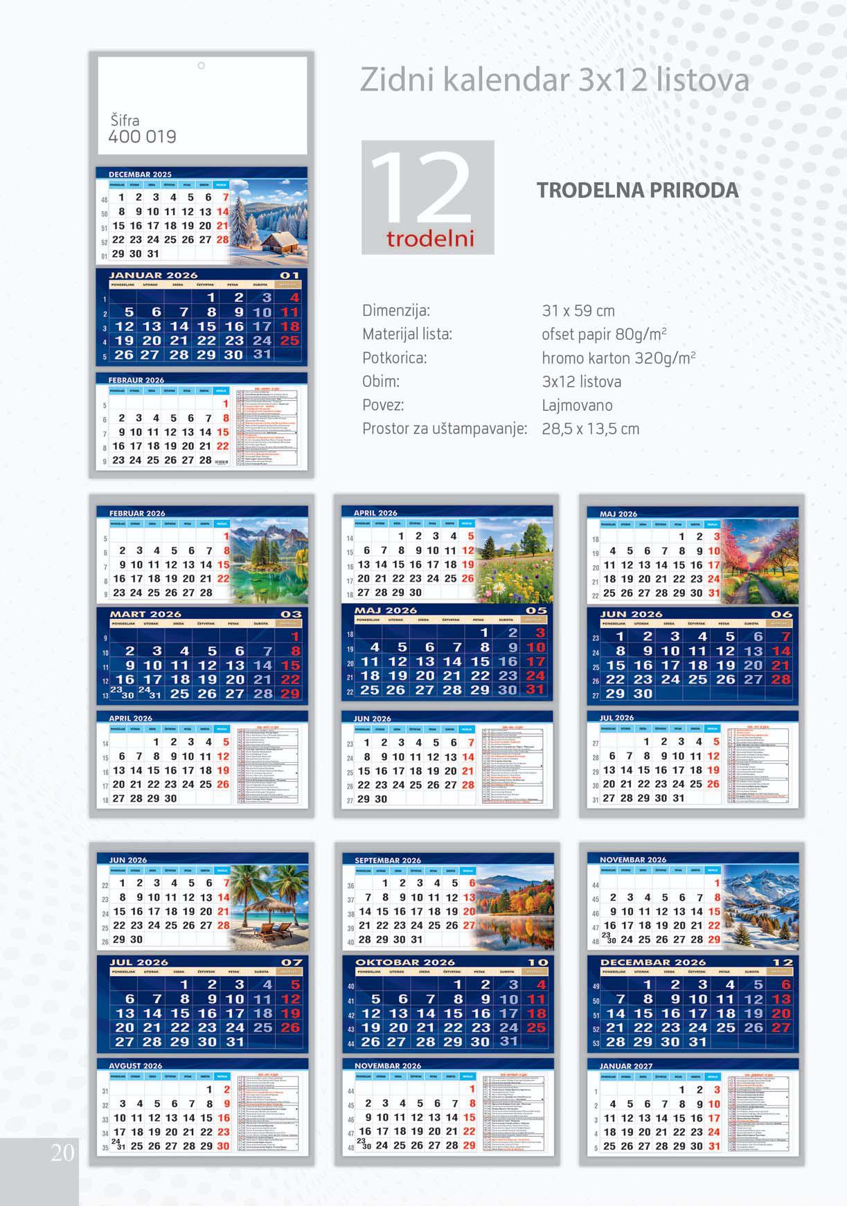 Dimenzija: 31 x 59 cmMaterijal lista: Kunstdruk 80g/m2Potkorica: Hromo karton 320g/m2Obim: 3x12 listaPovez: LajmovanoProstor za uštampavanje: 23,5 x 13,5 cm